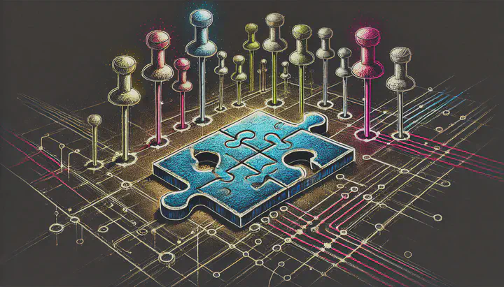 * Image Credit: DALL-E 3 with the prompt: Create an image where a puzzle game is featured at the center. As you move towards the outer edges of the image, the puzzle pieces seamlessly transform into pins. These pins are intricately connected to each other with wires, resembling a complex network of junctions in a bustling city. Ensure that the pins exhibit a variety of colors to enhance the vibrant and dynamic feel of the cityscape